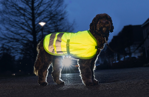 Ondanks dat het koud is en misschien zal regenen, zal de hond toch uitgelaten moeten worden. Tijdens de donkere dagen is het belangrijk dat zowel jij als jouw hond goed zichtbaar zijn, dit om onveilige situaties te voorkomen. Gelukkig zijn er verschillende producten die bijdragen aan de zichtbaarheid in het donker. De meest eenvoudige manier is het gebruik van een lichtgevende halsband. Dit is niet de reguliere halsband waar je de riem aan vastmaakt, maar een extra band die je om de nek van je hond kunt doen (uiteraard zit dit gewoon comfortabel). De meeste van dit soort banden kun je eenvoudig met een knopje aanzetten, waarna de gehele band licht geeft. Zo zullen voorbijgangers jouw hondje duidelijk kunnen zien lopen. Na het wandelen zet je hem eenvoudig weer uit.