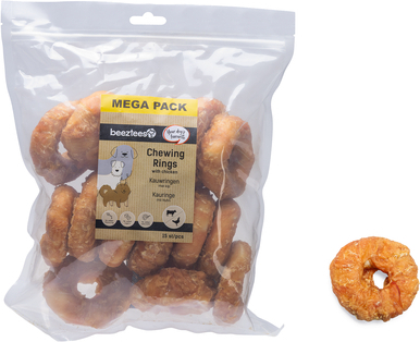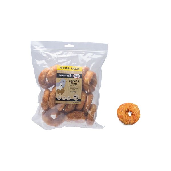 De kauwring met kip bevat geen toegevoegde smaak- en kleurstoffen, en geen suikers. Kauwen ondersteunt een schoon, sterk en gezond gebit en stimuleert de aanmaak van endorfine, wat je hond helpt ontspannen. Snacks mogen ongeveer 10% van de dagelijkse caloriebehoefte van je hond uitmaken. Koel en droog bewaren.