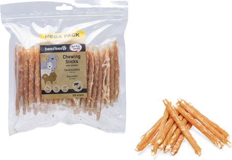De Beeztees Kauwstaaf Kip is een heerlijke hondensnack. Deze snack bestaat uit runderhuid waar kip aan is toegevoegd. De hondensnack is doorstraald om er zeker van te zijn dat eventuele schadelijke bacteriën gedood worden. Daarnaast is de snack vrij van kleur- en smaakstoffen en suikers.