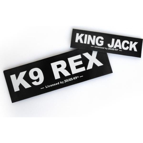 Elk label wordt exact volgens de ingevoerde naam geproduceerd en voorzien van het onderschrift “Licensed by Julius-K9”. Zo voeg je een herkenbaar en praktisch detail toe aan het tuig van je hond.