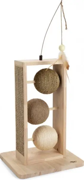 De Designed by Lotte Krabbollen Lomax zijn echt een design item voor in je huis, waarmee jouw kat veel krabplezier zal hebben! Met Lomax lijkt het wel alsof je 3 op een rij kunt spelen, want er zijn maar liefst drie krabbollen onder elkaar te vinden. Lomax is gemaakt rubberhout, wat mooi lichtcremig van kleur is. Daarnaast bevat iedere bal een eigen soort touw: jute, sisal of zeegras. Er hangt een leuke hengel met een speelveertje aan, voor extra speelplezier! Met deze krabbollen doe je niet alleen jouw kat een plezier, maar het staat ook echt fantastisch in je interieur! - Gemaakt van rubberhout - Gebruik gemaakt van 3 soorten touw: jute, sisal en zeegras Afmetingen: 34,5x29,5x50 cm