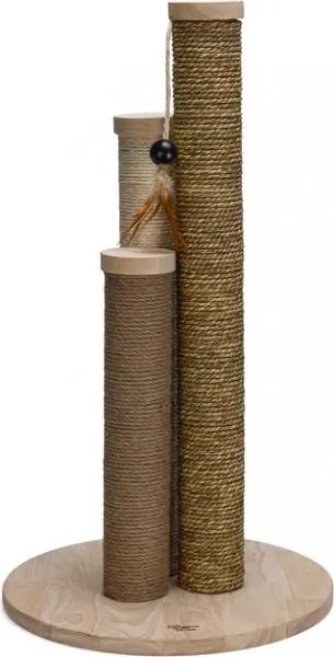 Wat deze Designed by Lotte Krabpaal Willa uniek maakt, is dat deze beschikt over niet een maar drie krabpalen. De verschillende krab oppervlakken op deze krabpalen zijn ieder gemaakt van een ander materiaal, namelijk jute, sisal en zeegras. Dit zorgt voor een afwisselende look en zo kan jouw kat zijn of haar nagels telkens weer aan een andere materiaalsoort slijpen. De bodem van de krabpaal is gemaakt van rubber hout. Bovendien hangt er aan de krabpaal een te gek kattenspeeltje, waardoor het voor jouw kat ook te gek is om met deze kattenkrabpaal te spelen. Designed by Lotte Krabpaal Willa is geschikt voor katten tot ca. 7 kg. Om de vloer te beschermen tegen krassen worden er anti slip dopjes meegeleverd voor onder de bodemplaat - 3 krabpalen - Zeegras, Jute en sisal krab gedeelten - Geschikt voor katten tot 7 kg - Inclusief kattenspeeltje - Rubberhouten voet - Inclusief beschermingsdopjes Afmetingen: 39,5x39,5x70 cm