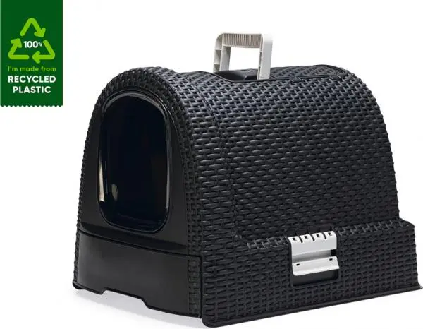 Deze Curver Kattenbak bestaat voor 95% uit gerecycled materiaal (huishoudelijk plastic afval en oude visnetten op de bodem van de zee (ocean waste)). De overige 5% zijn nieuwe grondstoffen. De hele kattenbak is op zijn beurt ook weer 100% recyclebaar. De kattenbak heeft een modieuze uitstraling doordat het een motief heeft van gevlochten rattan. De lade aan de voorkant heeft een plateau met gaatjes, waardoor de kat een groot deel van het kattenbakgrit achterlaat in de bak alvorens de kattenbak te verlaten. Door de uitschuifbare lade kan je in een oogopslag zien of de kattenbak aan verschoning toe is. Aan de bovenkant van de kattenbak bevindt zich een klepje waar de kattenbakschep opgeborgen kan worden. De Curver Kattenbak is zo mooi dat je nauwelijks ziet dat het een kattentoilet is. - Rattan motief - 100% recyclebaar - Gemaakt van 95% gerecycled materiaal - Eco-vriendelijk - Incl. schep - Verkrijgbaar in 5 verschillende kleuren. Afmeting: 51x38,5x39,5 cm