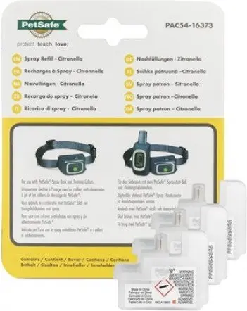 De Navulling Spray is een navulling voor de antiblaf- en trainingshalsbanden met spray van Petsafe. Je kunt kiezen tussen de varianten geurloos en Citronella. Deze spray ontmoedigt hinderlijk blaffen en helpt dit ongewenste gedrag bij uw huisdier af te leren. Tevens kan de spray gebruikt worden voor de trainingshalsband van Petsafe. De spray helpt je om jouw hond gemakkelijker te trainen op afstand. De spray is volledig onschadelijk voor jouw hond en helpt enkel je viervoeter ongewenst gedrag af te leren. Een spray patroon is goed voor ongeveer 35 – 40 sprays.