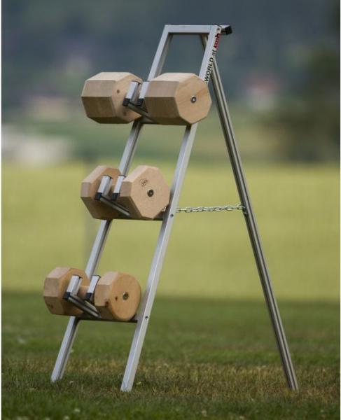 De halterstandaard is gemaakt voor drie halters, is opvouwbaar en na gebruik gemakkelijk op te bergen of te verplaatsen. Door de aluminium constructie is hij bijzonder licht en absoluut duurzaam.