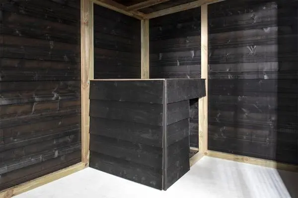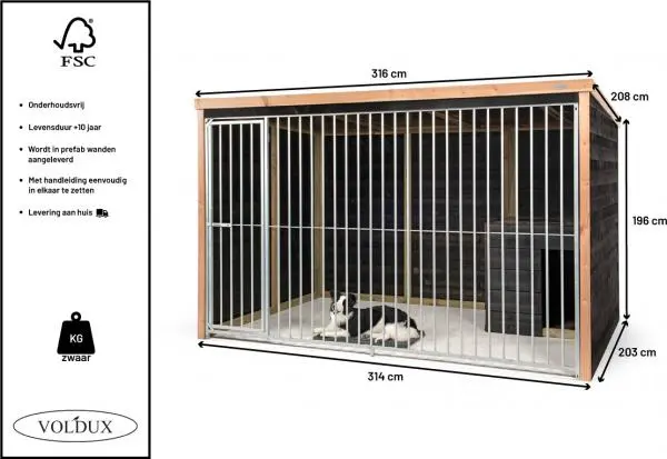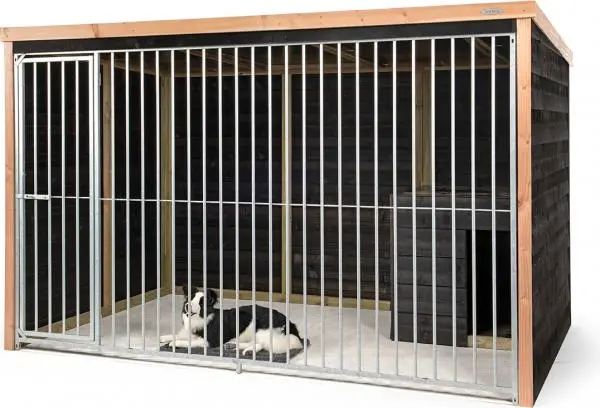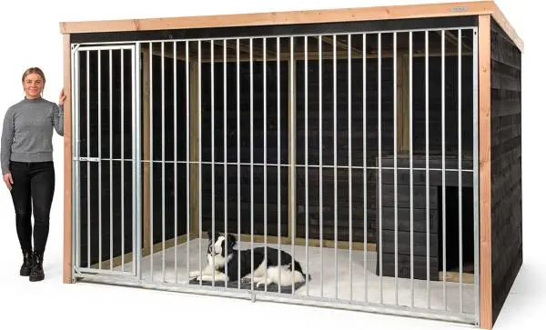De hondenkennel is gemaakt met een sterk, behandeld en geïmpregneerd houten frame. Het voordeel hiervan is dat de kennel wordt beschermd tegen verschillende weersomstandigheden. Zo is de kennel geschikt voor langdurig buitengebruik. De buitenzijde is afgedicht met zwarte potdeksel delen. De Douglas houten details zorgen voor een compleet totaalplaatje. Hij is niet alleen praktisch, maar ook een ware toevoeging in je tuin.