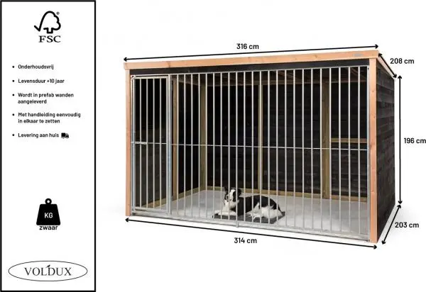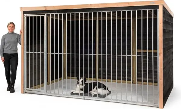 De hondenkennel is gemaakt met een sterk, behandeld en geïmpregneerd houten frame. Het voordeel hiervan is dat de kennel wordt beschermd tegen verschillende weersomstandigheden. De buitenzijde is afgedicht met zwarte potdeksel delen. De Douglas houten details zorgen voor een compleet totaalplaatje. Hij is niet alleen praktisch, maar ook een ware toevoeging in je tuin.