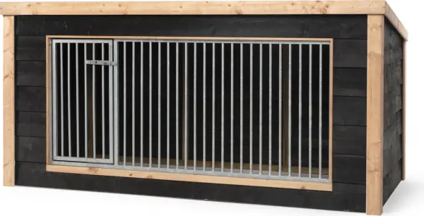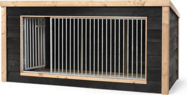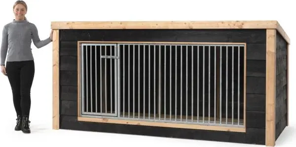 De hondenkennel is gemaakt met een sterk geïmpregneerd houten frame. De buitenzijde van dit frame is afgewerkt én verstevigd met Douglas balken en een zwarte potdeksel afwerking. Deze combinatie maakt dat het verblijf een prachtige uitstraling heeft.