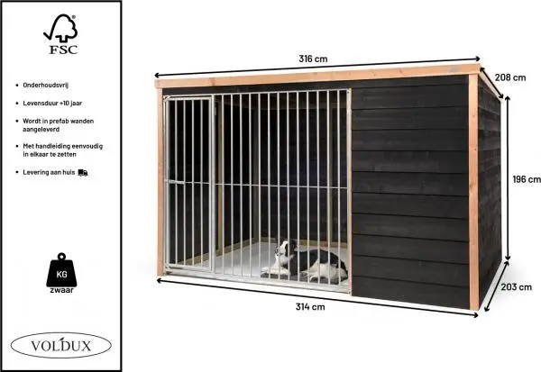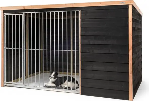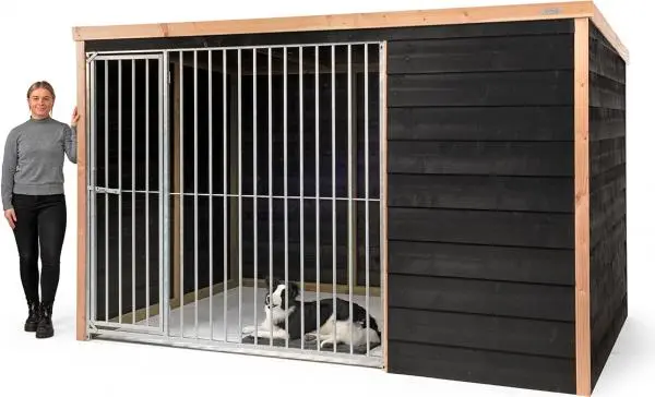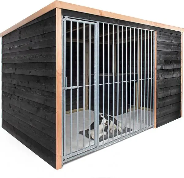 De hondenkennel is gemaakt met een sterk, behandeld en geïmpregneerd houten frame. Het voordeel hiervan is dat de kennel wordt beschermd tegen verschillende weersomstandigheden. De buitenzijde is afgedicht met zwarte potdeksel delen. De Douglas houten details zorgen voor een compleet totaalplaatje. Hij is niet alleen praktisch, maar ook een ware toevoeging in je tuin.