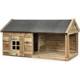 Een hondenhok met veranda en overkapping