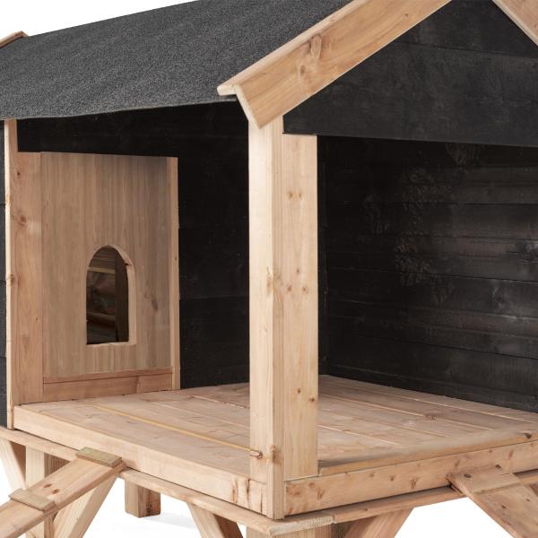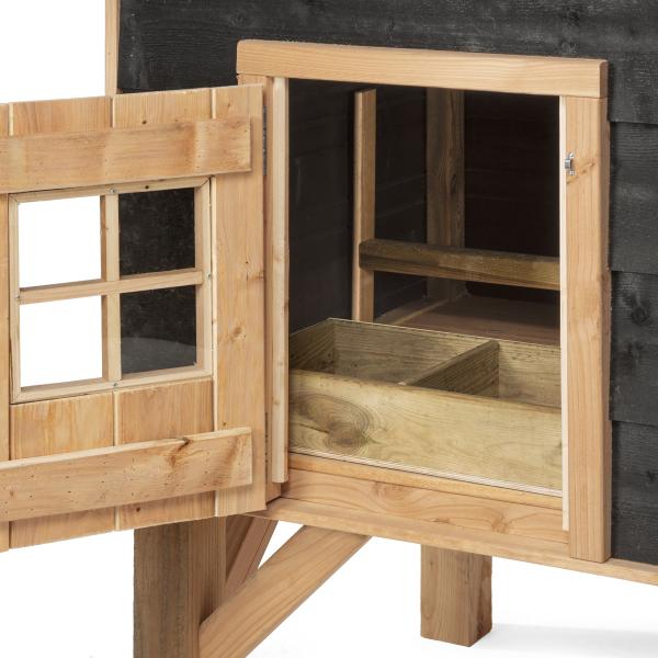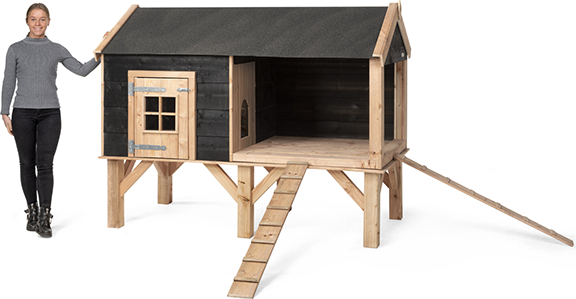 Het kippenhok heeft een afmeting van (l) 201 x (b) 107 x (h) 163 cm en wordt handmatig geproduceerd van hoogwaardige materialen. Dit maakt het luxe kippenverblijf onderhoudsvrij én van zeer hoge kwaliteit. Het kippenhok is opgebouwd uit een verhoogd Douglas houten frame, deze houtsoort is perfect voor buitengebruik én vraagt geen onderhoud. Dit geldt ook voor de zwarte potdeksel afwerking van het kippenhok. De combinatie van deze materialen geeft een mooie uitstraling aan het zwarte nachthok voor kippen. Het kippenhok is perfect gebruiken als nachthok in een kippenren en kan door via een van de kippentrapjes eenvoudig worden bereikt door jouw kippen. Hiernaast is het kippenhok voorzien van een zitstok voor de nacht én een ruim legnest voor jouw hennen. Ook aan een goede schoonmaak is gedacht, de deur aan de voorzijde geeft namelijk perfecte toegang voor de schoonmaak van het verblijf én natuurlijk voor het rapen van de kippeneitjes. Dit luxe kippenverblijf biedt een fijne, comfortabele én beschermde plek voor jouw kippen.