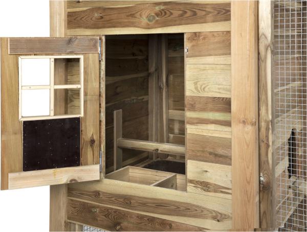 Heeft u interesse in een verblijf die 10 tot 15 jaar mee gaat? Dan is een Voldux verblijf voor u de juiste keus. Deze prachtige hooiberg wordt geproduceerd door gespecialiseerde vakmannen van Voldux die zorgen voor een perfect resultaat. Het verblijf wordt volledig gemaakt van geïmpregneerd hout. Dit maakt het hok onderhoudsvrij en zeer geschikt voor buiten.  Het hok is voorzien van een binnen verblijf. Door middel van een deur is dit verblijf goed te bereiken. In het nachthok staat een legbak, waardoor de eieren gemakkelijk te pakken zijn.