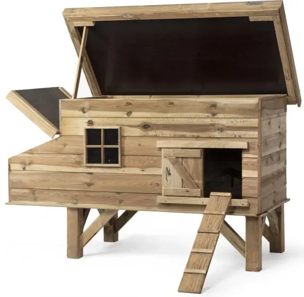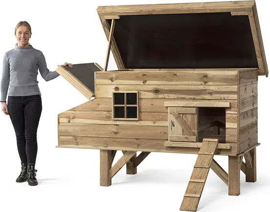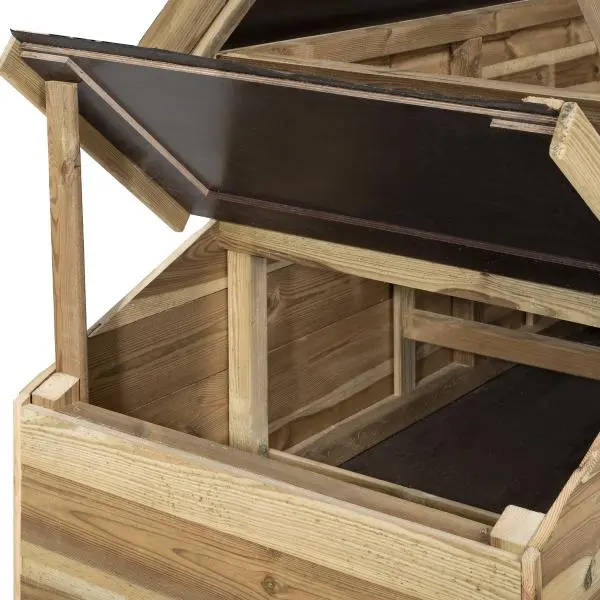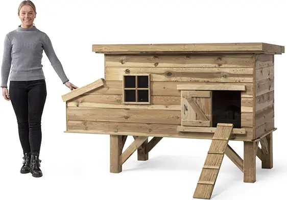 Dit luxe kippenhok kan perfect gebruikt worden als nachtverblijf in jouw kippenren of dieren ren. Het grote nachthok voor kippen is gemaakt van geïmpregneerd hout dit zorgt ervoor dat het kippenhok onderhoudsvrij is en geen jaarlijkse beits of schilder beurt vraagt. Dit prachtige kippenhok heeft een afmeting van (l) 190 x (b) 88 x (h) 110 centimeter en biedt ruimte aan meerdere kippen. Het verblijf is verhoogd waardoor het meer warmte en comfort biedt aan de kippen tijdens koudere dagen. Het nachthok is voorzien van een zitstok voor de nacht en een af te sluiten deur, waarmee je de kippen in de nacht kunt beschermen tegen roofdieren. Het legnest beschikt over van een open te klappen dakje, hierdoor hoef je het hok niet te betreden voor het rapen van eieren. Dit kippen nachthok wordt handmatig geproduceerd en wordt (gedeeltelijk) bij je thuis afgeleverd.