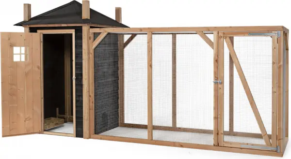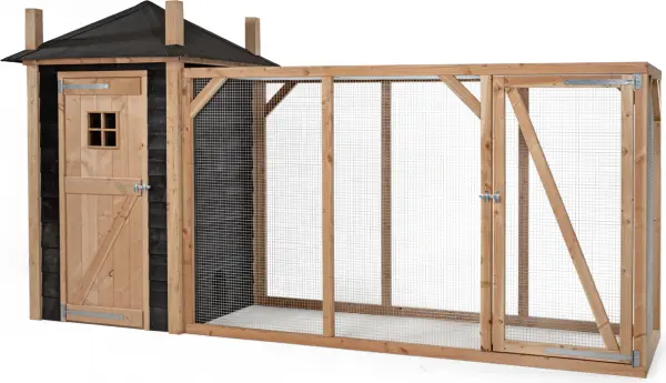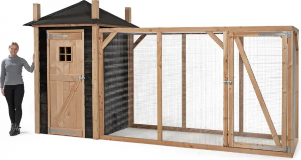 Dit robuuste kippenhok voor buiten heeft een stijlvolle kleuren combinatie, is gemaakt van hoogwaardige materialen én biedt een levensduur van 10 tot 15 jaar. Hiernaast is het verblijf onderhoudsvrij door het gebruik van onderhoudsvrije geïmpregneerde materialen welke bestand zijn tegen de verschillende weersinvloeden. Dit grote kippenhok heeft een totale (buiten) afmeting van (l) 437 x (b) 150 x (h) 225 centimeter en biedt enorm veel veilige en comfortabele ruimte aan jouw kippen.Dit prachtige kippenhok bestaat uit een groot stevig kippen nachthok én een scharrelgedeelte. Het nachthok van dit verblijf is opgebouwd met geïmpregneerde balken welke een stevige basis bieden. De buitenzijde van het nachthok is voorzien van Douglas balken en is afgewerkt met zwarte potdeksel delen. Deze combinatie van materialen is opvallend stijlvol en geeft een hoogwaardige uitstraling aan het kippenhok. Het robuuste dak is voorzien van zwart dakleer wat zorgt voor een goede bescherming en afwatering. Het nachthok beschikt over een zitstok voor de nacht, een legnest en een grote toegangsdeur waarmee je zelf altijd goede toegang hebt tot het verblijf én jouw kippen. Via de open doorgang kunnen jouw kippen zo de kippenren in scharrelen. Deze ruime Douglas kippenren is voorzien van stevig gaas op de wanden én het dak. Veel lichtinval maar geen kans op ontsnappen in dit kippenhok dus. De kippenren beschikt tevens over een toegangsdeur waarmee je eenvoudig zelf de kippenren kunt betreden. Dit hoogwaardig én stijlvol kippenhok met grote ren is een aanwinst voor jouw kippen én biedt een sfeervolle uitstraling in de achtertuin.