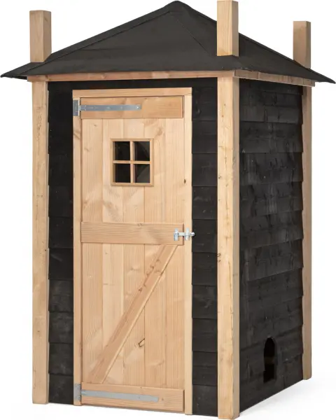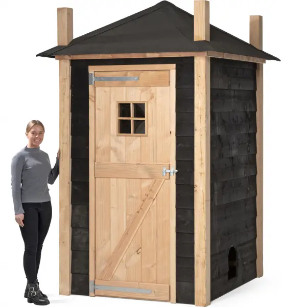 Dit hoogwaardige kippenhok wordt handgemaakt met gebruik van onderhoudsvrije materialen. Dit geeft het kippenhok niet alleen een bijzonder mooie uitstraling, het verblijf is hierdoor ook onderhoudsvrij. Deze grote hooiberg voor kippen heeft een totale (buiten) afmeting van (l) 150 x (b) 150 x (h) 225 centimeter waardoor hij perfect tot zijn recht komt in een grote kippenren.Voor de opbouw van Hooiberg Mees is gekozen voor geïmpregneerde houten balken. Deze balken vormen samen het robuuste frame van de hooiberg. Aan de buitenzijde is het frame verstevigd en afgewerkt met Douglas houten balken. Deze Douglas balken steken uit boven het dak wat de uitstraling geeft van een klassieke kippen hooiberg. Voor de afwerking van het kippenhok zijn zwarte potdeksel delen gebruikt. De combinatie van de robuuste Douglas balken en de zwarte potdeksel delen geeft het verblijf een zeer stijlvolle kleurencombinatie. Dit maakt het kippenhok niet alleen een aanwinst voor jouw kippen, het is ook een sfeervolle toevoeging in de achtertuin.Dit hooiberg nachtverblijf voor kippen beschikt over een grote toegangsdeur aan de voorzijde. Deze toegangsdeur is voorzien van een haaksluiting én een venster met plexiglas. Hierdoor kun je altijd in het verblijf kijken zonder de deur te hoeven openen. In het nachthok bevindt zich een legnest voor de hennen én een zitstok voor de nacht. Het nachthok is aan één zijde voorzien van een vrije uitgang voor de kippen, dit maakt het nachthok perfect geschikt voor in een kippenren.