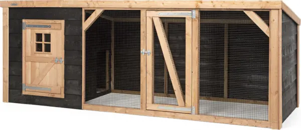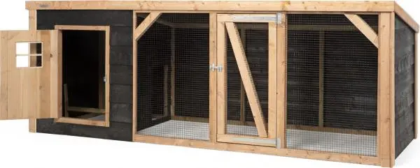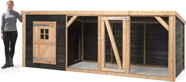 Het kippenhok is handgemaakt met gebruik van onderhoudsvrije en duurzame materialen. Dit kippenhok heeft een totale (buiten) afmeting van (l) 342 x (b) 130 x (h) 132 centimeter en biedt hiermee ruimte aan het huisvesten van meerdere kippen. Dit luxe kippenhok is gemaakt op basis van een frame van geïmpregneerde balken, aan de buitenzijde is het verblijf afgewerkt met Douglas balken en zwart potdeksel. Deze behandelde materialen zijn ideaal voor buiten gebruik en vragen hierbij geen jaarlijkse schilder of beitsbeurt. Het kippenhok is afgewerkt met zwart gaas was het verblijf een stijlvol totaalplaatje geeft. Kippenhok Milan XL is een van de grotere kippenhokken uit de Voldux collectie. Het verblijf bestaat uit een kippenren gedeelte én een ruim opgezet nachthok voorzien van een legnest en een zitstok voor de nacht. Het nachthok van het kippenhok beschikt over een toegangsdeur zodat je zelf goed bij de kippen kunt komen én een vrije doorloop voor de kippen vanuit het nachthok naar de kippenren. De kippenren heeft een ruime oppervlakte om te kunnen scharrelen en is tevens voorzien van een deur voor goede toegang. Doordat de kippenren aan drie zijdes is gesloten én voorzien is van een met dakleer bekleed dak ontstaat een goede afwatering op het verblijf. Dit maakt het mogelijk voor jouw kippen ook op regenachtige dagen te genieten van de buitenlucht.