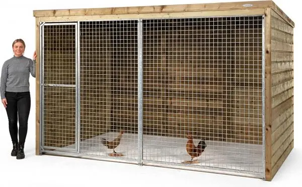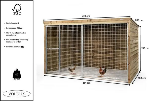 Kippenren Bram is een geïmpregneerde, onderhoudsvrije kippenren geschikt voor langdurig buitengebruik. De ren is vervaardigd uit geïmpregneerd grenenhout, wat een levensduur van minimaal 10 – 15 jaar zonder onderhoud. De kippenren is overdekt en voorzien van een dak met dakleer bekleedt, hierdoor ontstaat een optimale afwatering op het verblijf en bescherming van jouw kippen in de ren. Hiermee kunnen jouw kippen van de scharrelruimte genieten ondanks regenval in de herfst of sneeuw in de winter maar ontstaat ook een schaduwplek in de zomermaanden. Het kippenverblijf heeft een gegalvaniseerd open gaaspaneel aan de voorzijde, met mazen van 5 x 5 centimeter voorzien van een handige deur met grendel. Hierdoor valt er veel licht in de ren en kun je jouw kippen ook vanaf een afstandje goed zien. Deze behandelde kippenren wordt handgemaakt, voorbewerkt en als bouwpakket bij je thuis bezorgd. Eenvoudig te monteren met de bijgeleverde montagehandleiding.