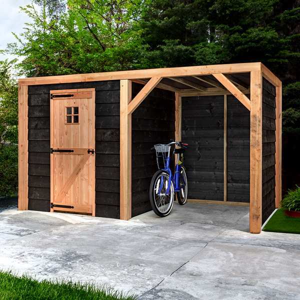 Tuinberging Moos heeft een afgesloten berging met daaraan vast een kleine overkapping. De overkapping is geschikt om bijvoorbeeld fietsen onder te plaatsen. In de berging zelf kun je dingen plaatsen die je graag wilt afschermen. Je betreed de berging eenvoudig middels de deur aan de voorkant, deze kun je afsluiten middels een schuifslot. De tuinberging is gemaakt van Douglas hout in combinatie met zwarte potdeksel delen. Dit maakt hem onderhoudsvrij én zorgt voor een lange levensduur van ongeveer 10-15 jaar.