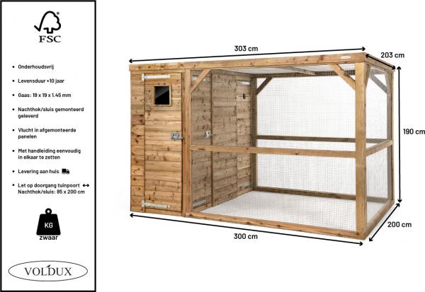 Het nachthok/sluis staat bij levering volledig in elkaar en hoeft daardoor enkel op zijn plaats gezet te worden. De vlucht wordt in panelen geleverd en is erg eenvoudig in elkaar te zetten.