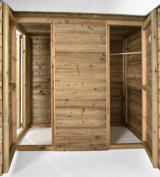 Aan de linkerkant van het verblijf bevindt zich een nachthok met toegangsdeur. Het nachthok is tevens voorzien van een eenvoudig voedersysteem. Zo kun jij je vogels voederen en vers water geven zonder dat de kans bestaat dat ze ontsnappen. Daarnaast is in het nachthok ook nog een zitstok aanwezig. Wil je het nachthok liever aan de andere kant? Neem dan een kijkje bij ons Timo Rechts model.