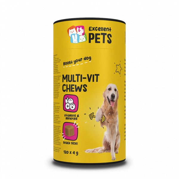 Excellent Pets Mutli-Vit Chews is een aanvullend diervoeder voor honden in de vorm van zachte kauwsnoepjes. Het zit boordevol vitaminen, mineralen en sporenelementen om de weerstand, stofwisseling en de mineralenbalans te ondersteunen.