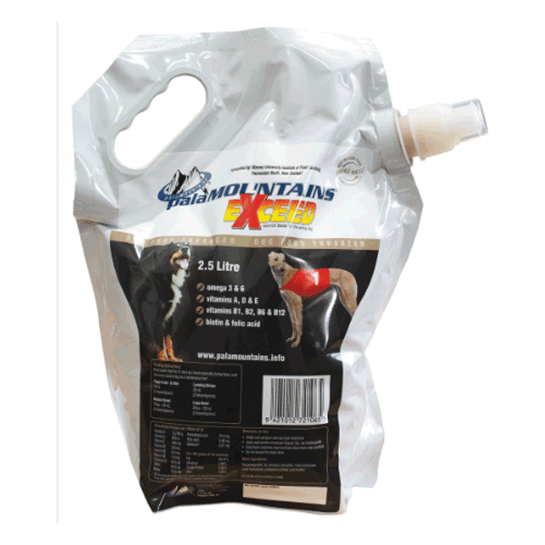 PalaMOUNTAINS Exceed is een revolutionair vloeibaar multivitaminen- en mineralensupplement, speciaal ontwikkeld voor werkhonden zoals windhonden, jachthonden, behendigheidshonden en honden die actief zijn op boerderijen. Dit supplement bevat zowel in water- als in vet oplosbare vitaminen en mineralen, allemaal zorgvuldig gesuspendeerd in een omega-3 en omega-6 vetzuurbasis voor een uitstekende absorptie van maar liefst 99,5%.