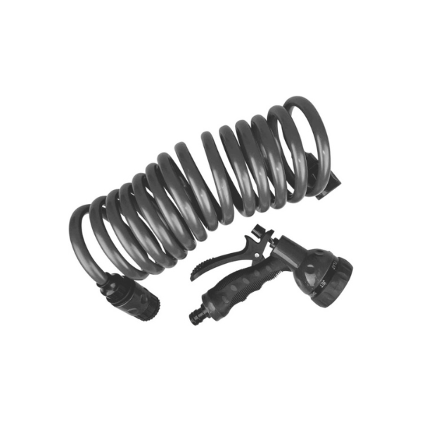 Sproeikop met meerdere standen. Iedere stand is vast te zetten met het beugeltje op de sproeikop. Slang vormt zich weer terug in een kronkel waardoor je geen 7.8 meter slang in uw salon heeft liggen. Praktisch en efficiënt!